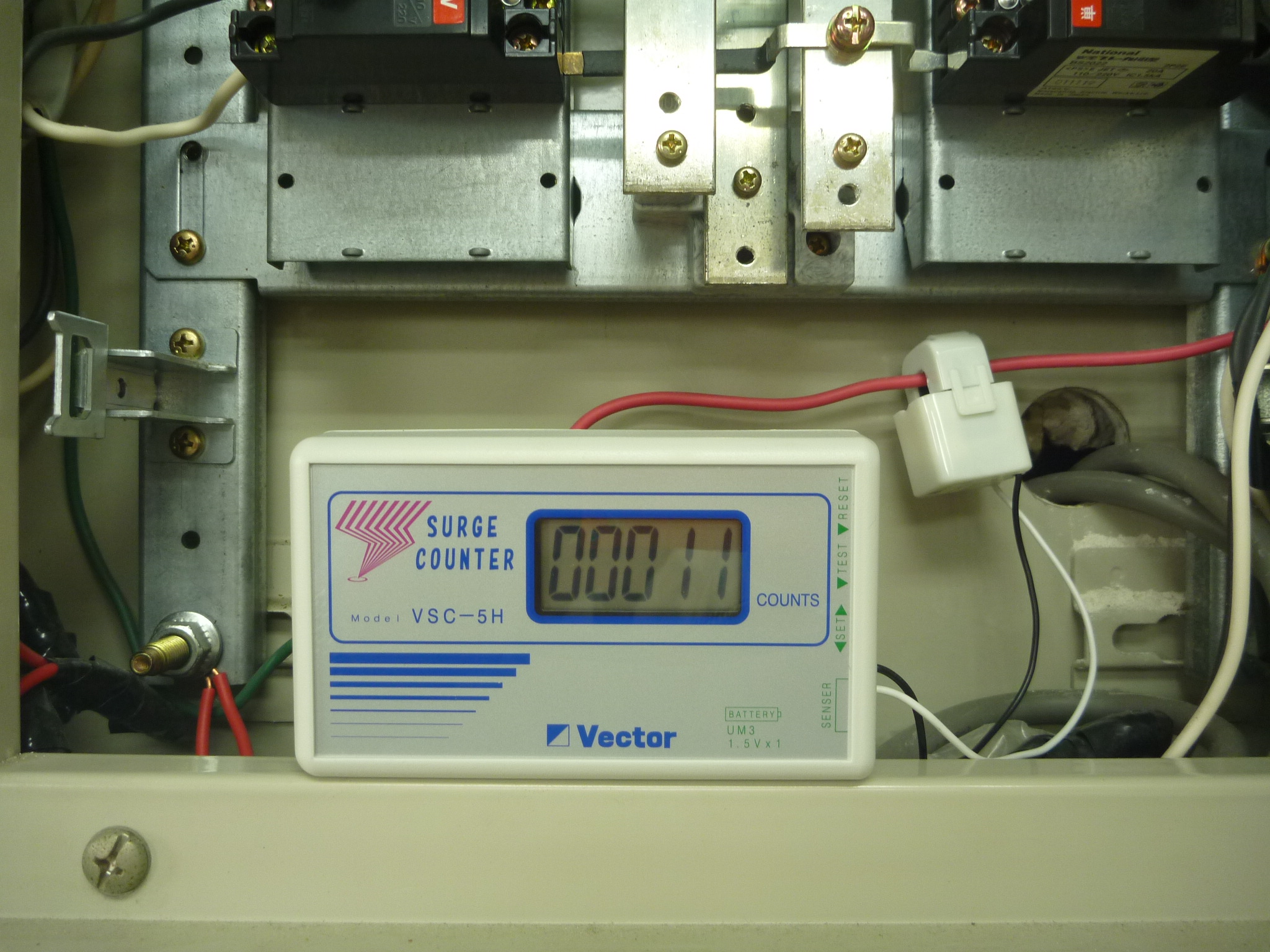 しかしその場所、その建物が年間を通じて雷の襲撃をどの程度受けているかは、雷サージカウンター(雷による過電流が流れた回数を計測する機器)を設置してデータを取ることによって調査することが可能です。一年を通して、襲雷頻度が多い箇所は強い雷に遭う確率も高く相対的に雷害リスクが高い、一方で頻度が少ない場合はリスクが低いと判断できるので、取るべき対策の程度や優先順位を判断する参考になります。