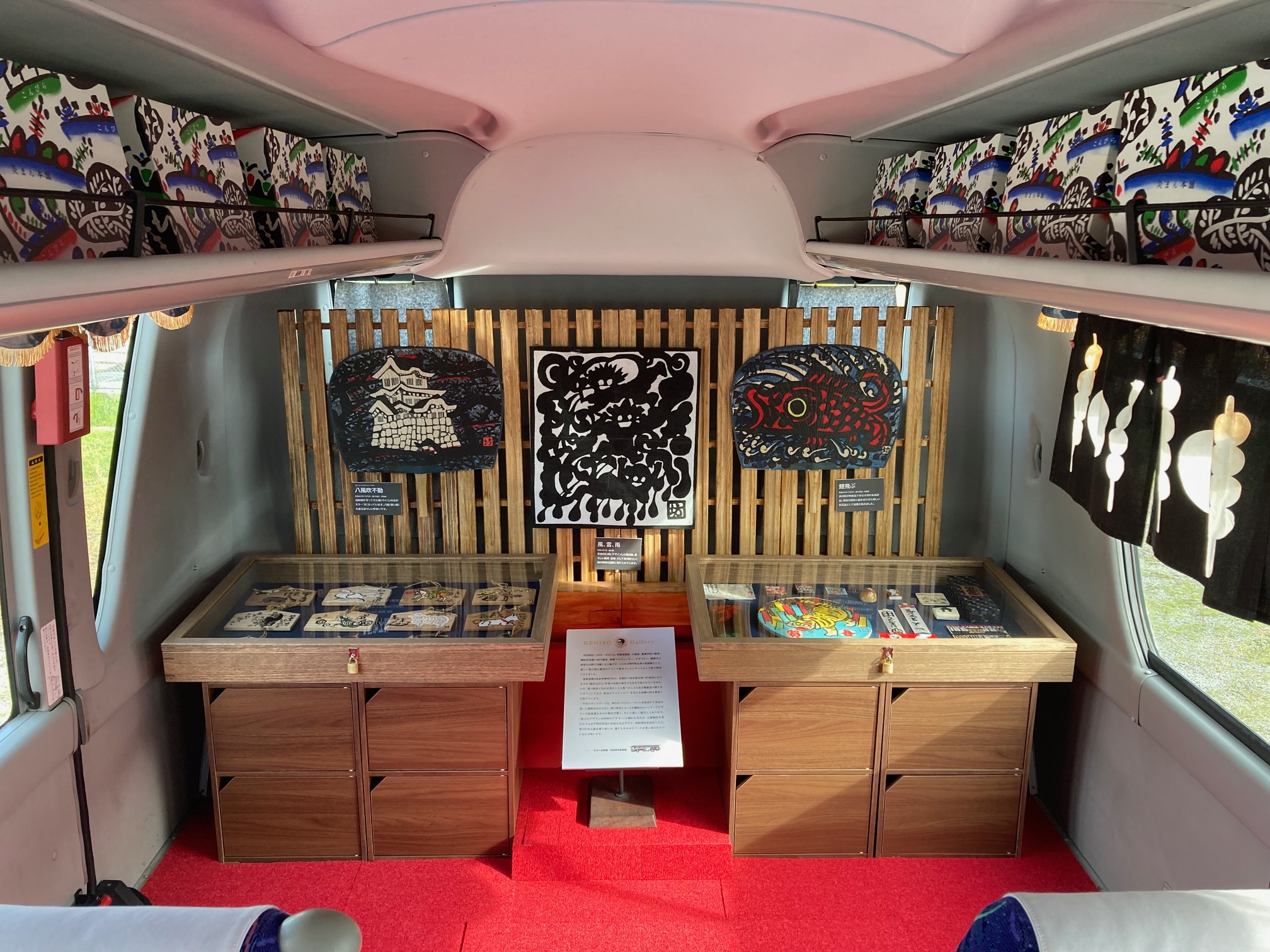 バスの車内は、後部座席を改造してKUNIBO Galleryを設置しました。展示作品は邦坊がプロデュースした民芸品や調度品、邦坊が考案した大判の丸亀団扇や風呂敷など。香川県民にお馴染みのパッケージ商品や絵葉書などの小物は、バスの停車時に観覧し、気になったものは現地でお土産として買うこともできます。
