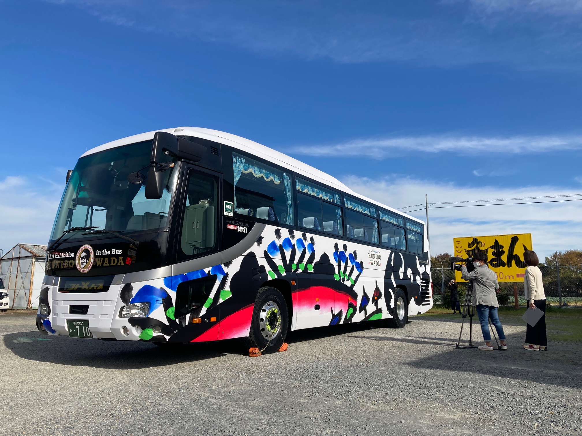 和田邦坊のラッピングバスは、コロナ禍で大きな影響を受けた琴平町の観光復活に向け、観光庁「既存観光拠点の再生・高付加価値化推進事業」の採択を受けて取り組む事業者連携プロジェクト「琴平アーティスト&クリエイターinレジデンス」の一環で、同町の和菓子店「灸まん本舗石段や」(旧店名:こんぴら堂)と灸まん美術館(善通寺市)の協力により実現したものです。