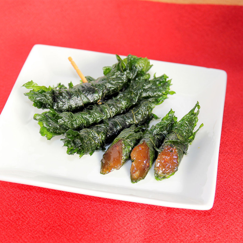 いわき産の玄米みそをしその葉で巻いて揚げた「みそしそ巻」のセットです。玄米みそのほどよい甘みと、パリパリのしその香ばしさが絶妙にマッチした、東北伝承の味わい。ご飯のお供やお酒のおつまみにもぴったりの逸品です。