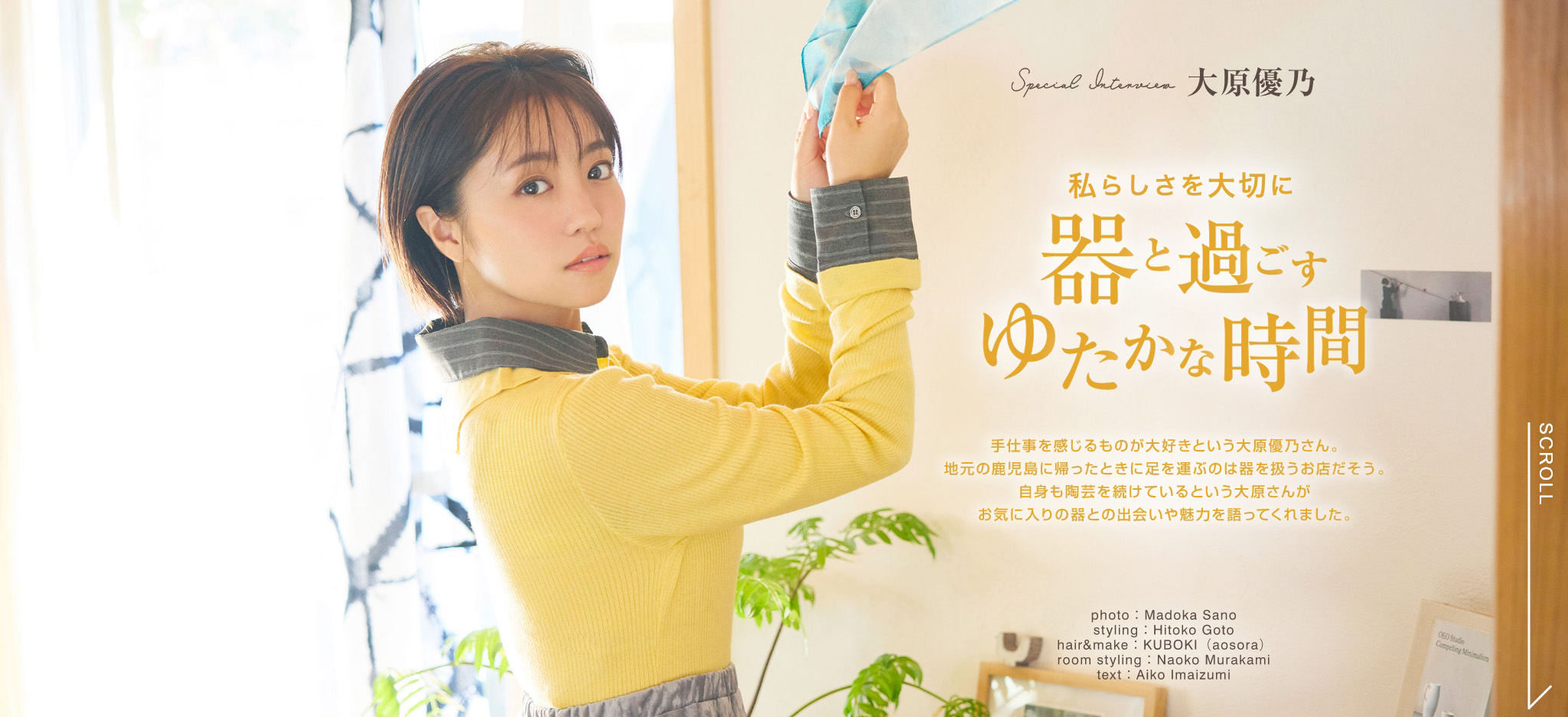 巻頭特集に登場するのは前号に引き続き、大原優乃さん。手仕事を感じるものが好きだという大原さんに、つくり手の気持ちが伝わる、温かみのあるアイテムに囲まれて暮らしている女性を演じていただきました。岩手県を代表する伝統工芸品・南部鉄器の茶器でお茶を淹れたり、お気に入りの小物が並ぶ棚を眺めたり……。心が豊かになるような時間を体験いただきました。